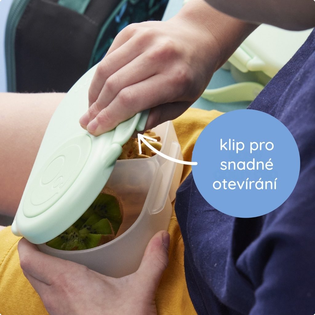 Díky flexibilnímu silikonovému víčku na jedné straně můžete do krabičky vložit celý kus ovoce (např. jablko) a do druhé třeba i jogurt nebo pyré (nikoliv tekutiny). Jednoduché otevírání umožní dětem samostatně se obsloužit.
