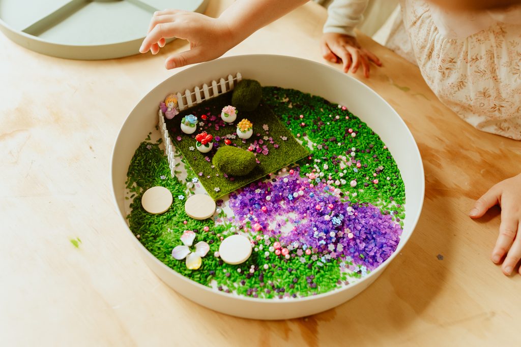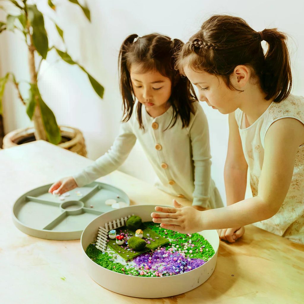 V kombinaci se senzorickým tácem Play Tray vzniká malá zahrada plná detailů, kterou si dítě může upravovat podle své nálady – přidávat květiny, stavět cestičky nebo skrývat drobné poklady.