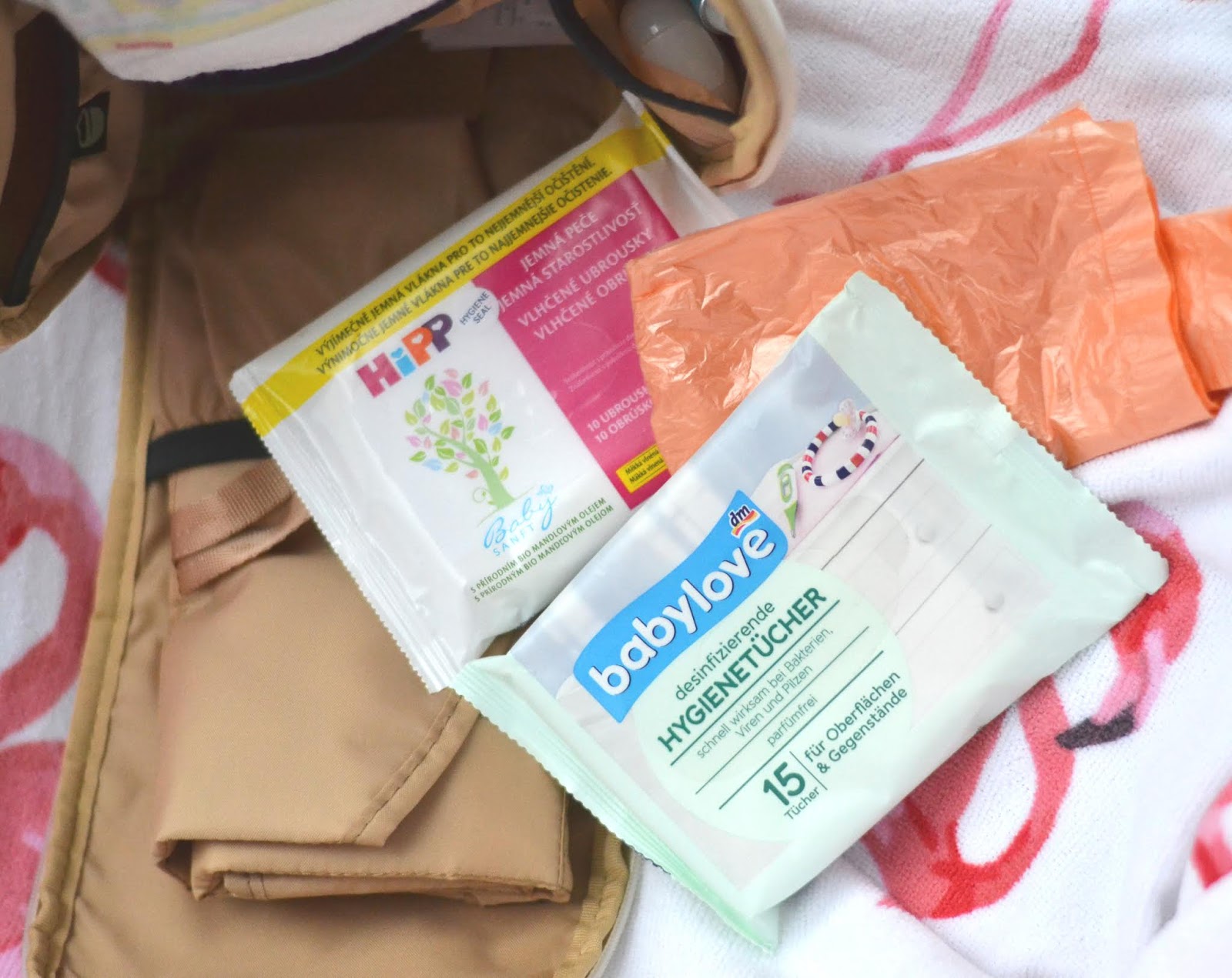 Nesmí chybět vlhčené ubrousky (střídám značky, které prodávají mini verze, které jsou takhle do tašky skladnější) a taky ty dezinfekční (vždycky mám lepší pocit, když přebalovací pult třeba v nějaké restauraci, můžu nejdříve utřít tímto a až pak na něj dám podložku. A nechybí ani sáčky na použité plenky (seženete třeba od Babylove v DMku).