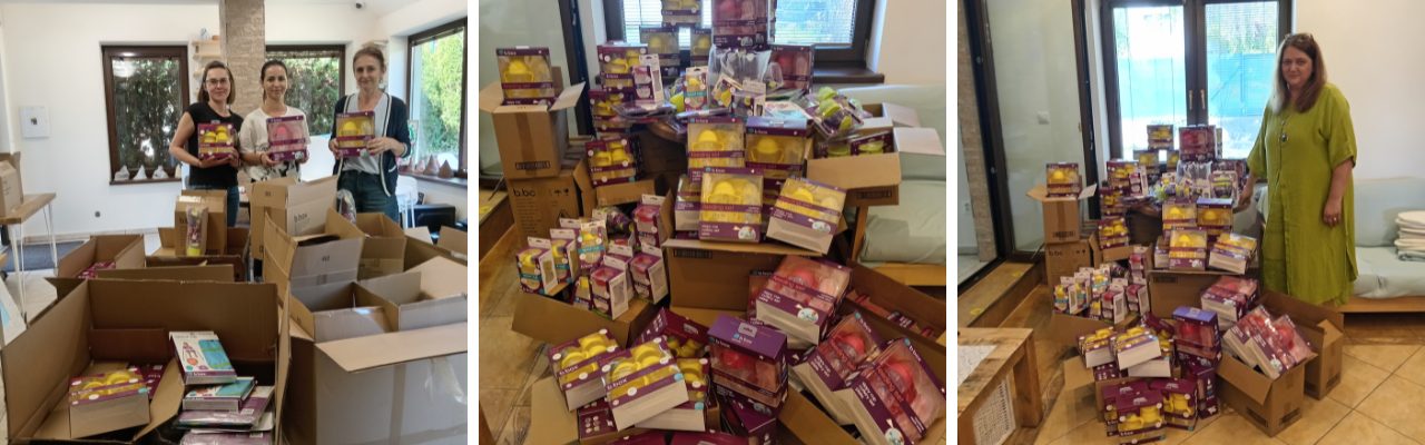 A i když jsme se tentokrát kvůli vzdálenosti nemohly s týmem Slniečka potkat osobně, naše velké balíky si tam i tak našly cestu. Do Nitry jsme poslaly stovky produktů značky b.box – lahvičky na pití s brčkem, hrnečky, misky, jídelní sety, bryndáky i další praktické věci pro malé děti. Produkty už teď dělají radost v rodinách, kde pomáhají překlenout těžké začátky.